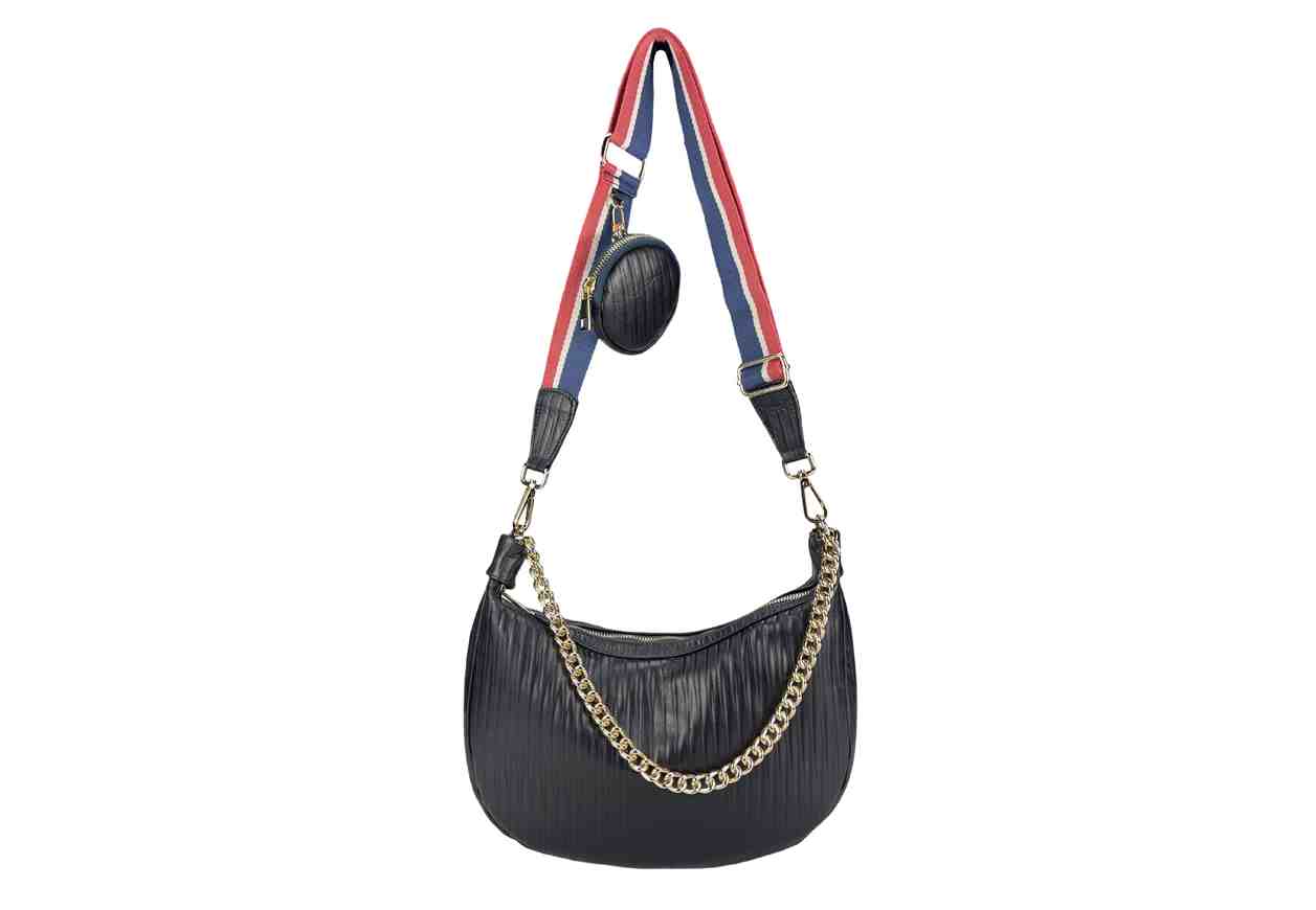 Borsa a spalla con doppia tracolla una in metallo una in ,materiale tecnico e portamonete in coordinato.