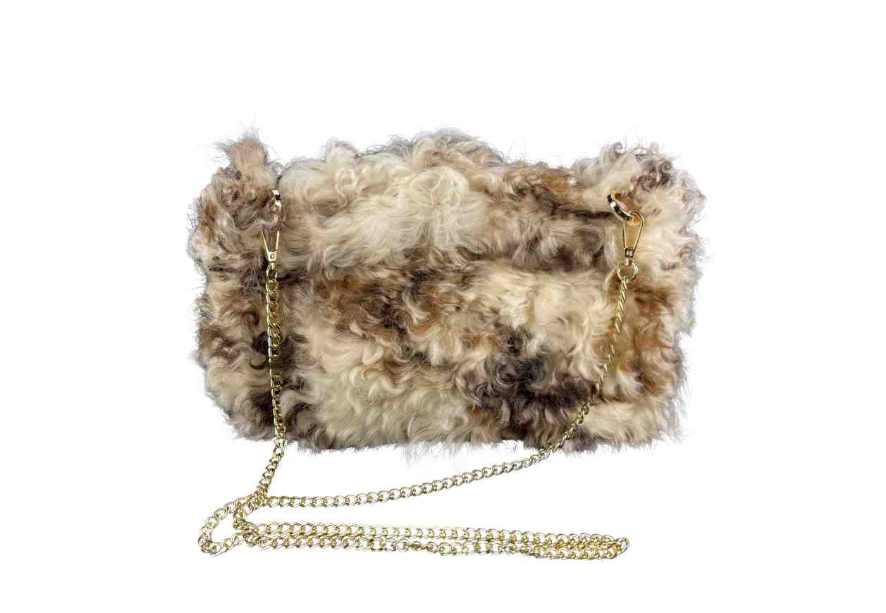 Borsa in 100% agnello con chiusura a bottoni e tracolla metallica.