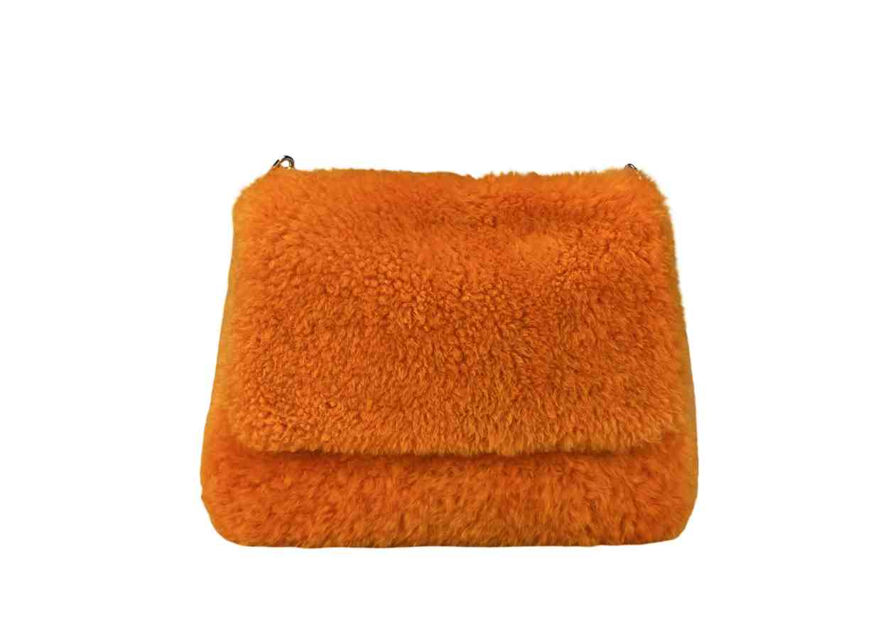 Borsa in 100% Merinillo e interno pelle, con tracolla e chiusura a patta.