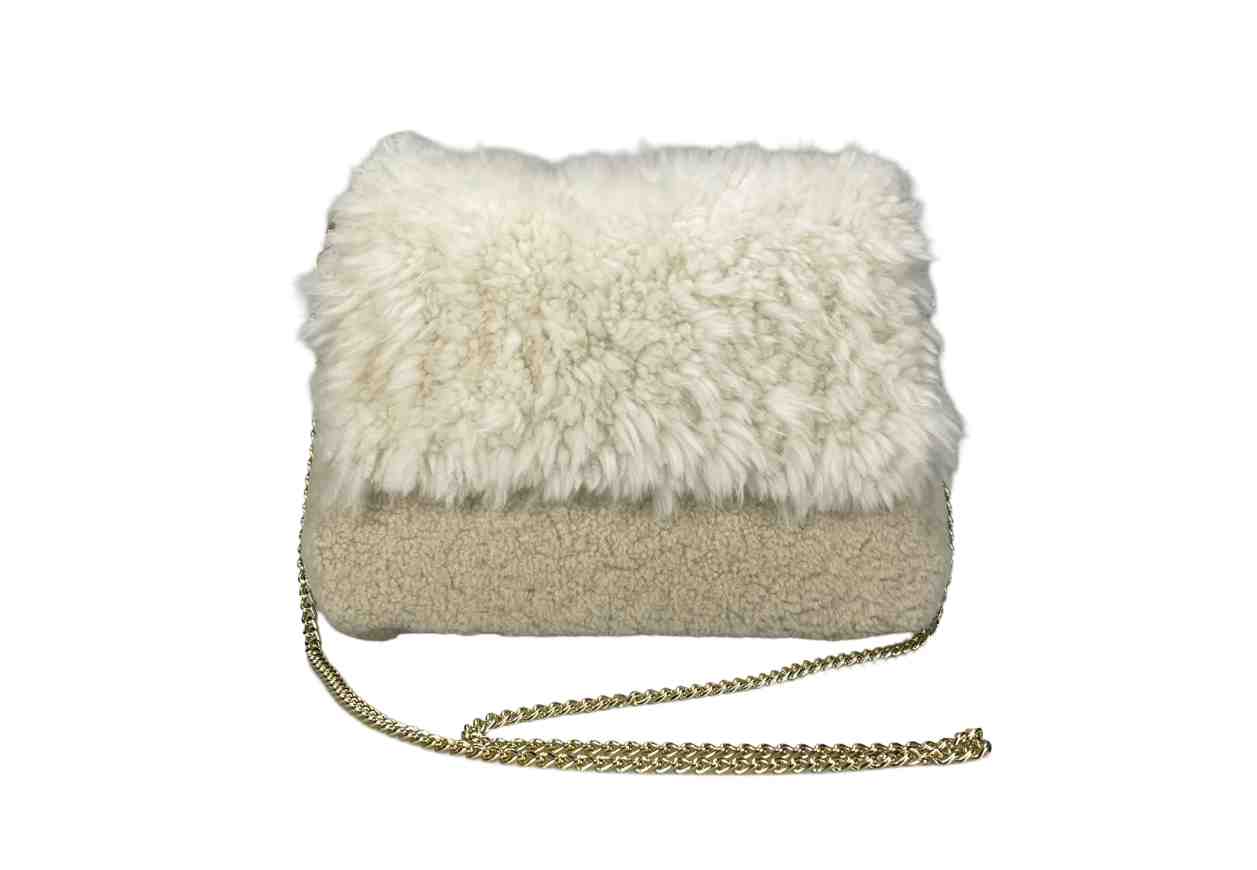 Borsa con patta in montone riccio, tracolla e tasche interne. Fodera in pelle di vitello.