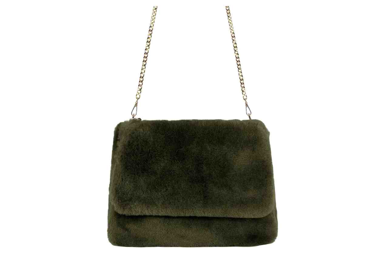 Borsa in 100% montone rasato, chiusura a patta e tracolla metallica.