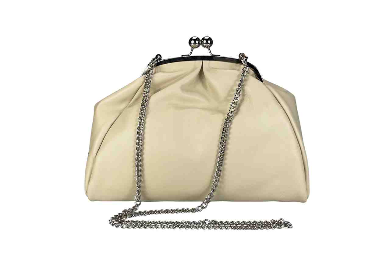 Borsa in 100% pelle spazzolata, chiusura a clutch e tracolla metallica.MADE IN ITALY