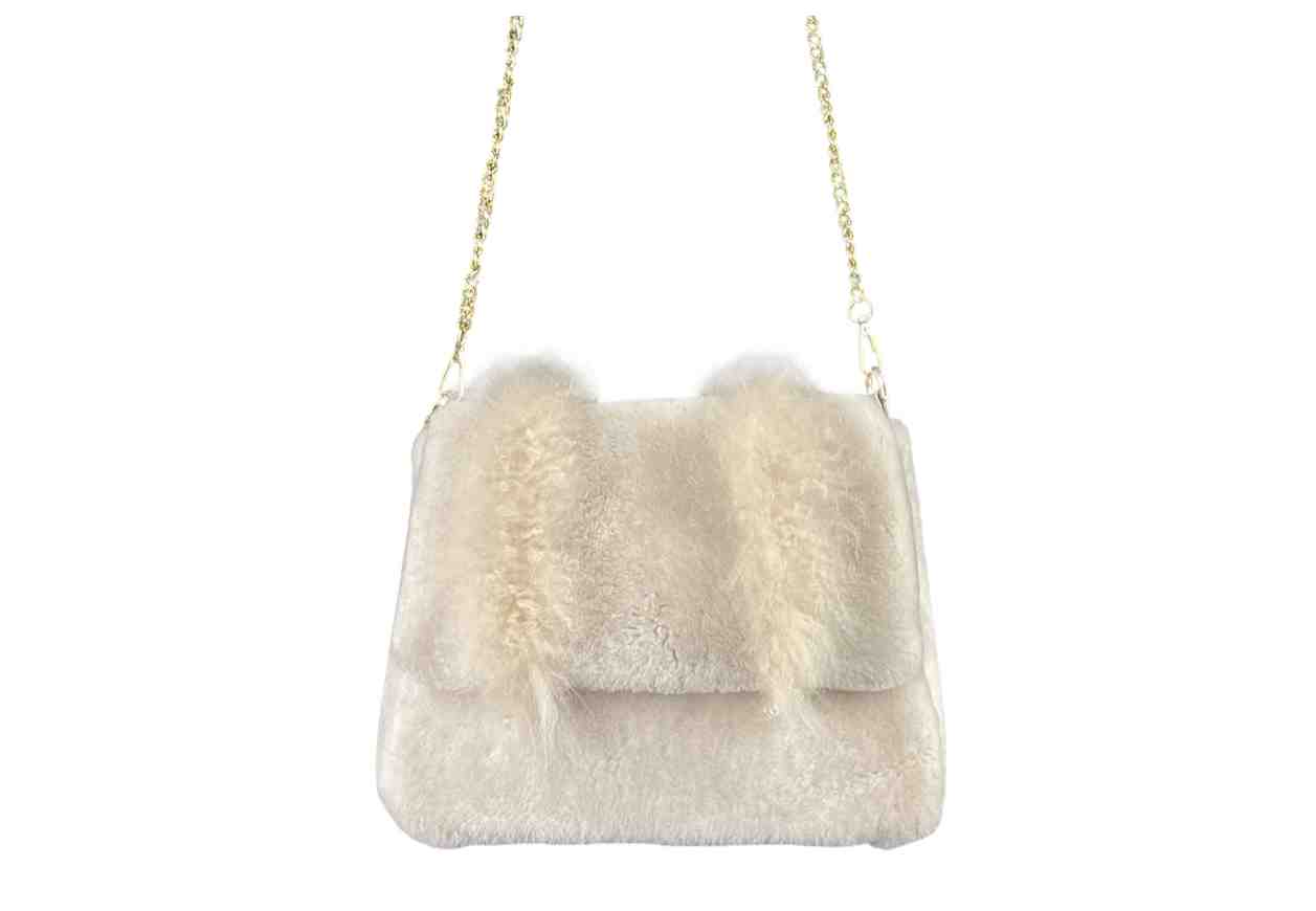 Borsa in montone rasato e capra mongolia, chiusura a patta e tracolla metallica.