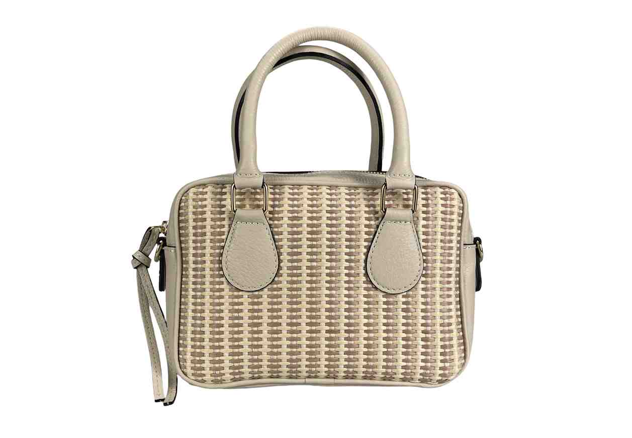 Borsa in pelle di vitello e rafia, manici tracolla e zip.