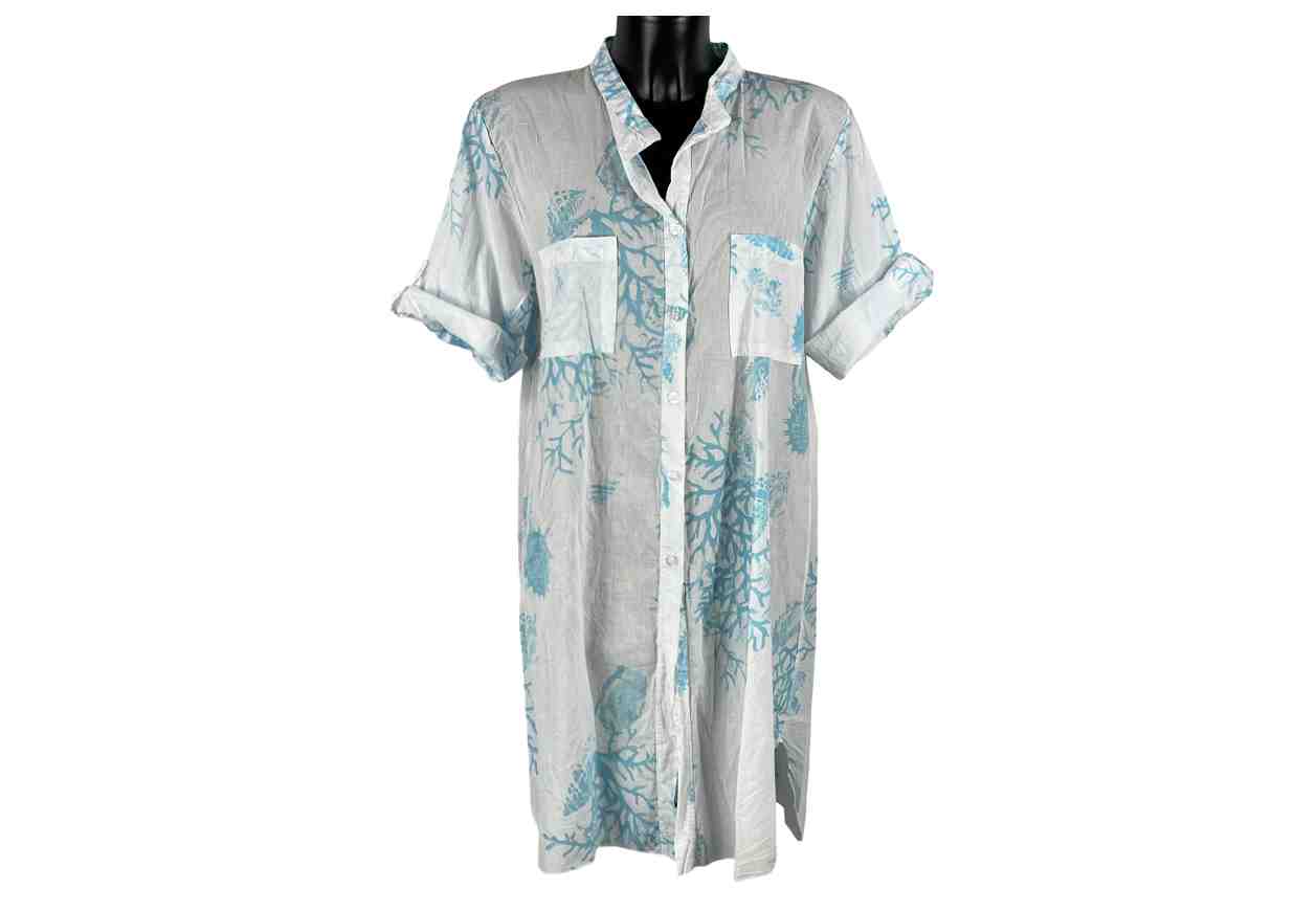 BUTTERFLY Abito chemisier in fantasia coralli, collo alla coreana, tasche frontali e maniche regolabili.