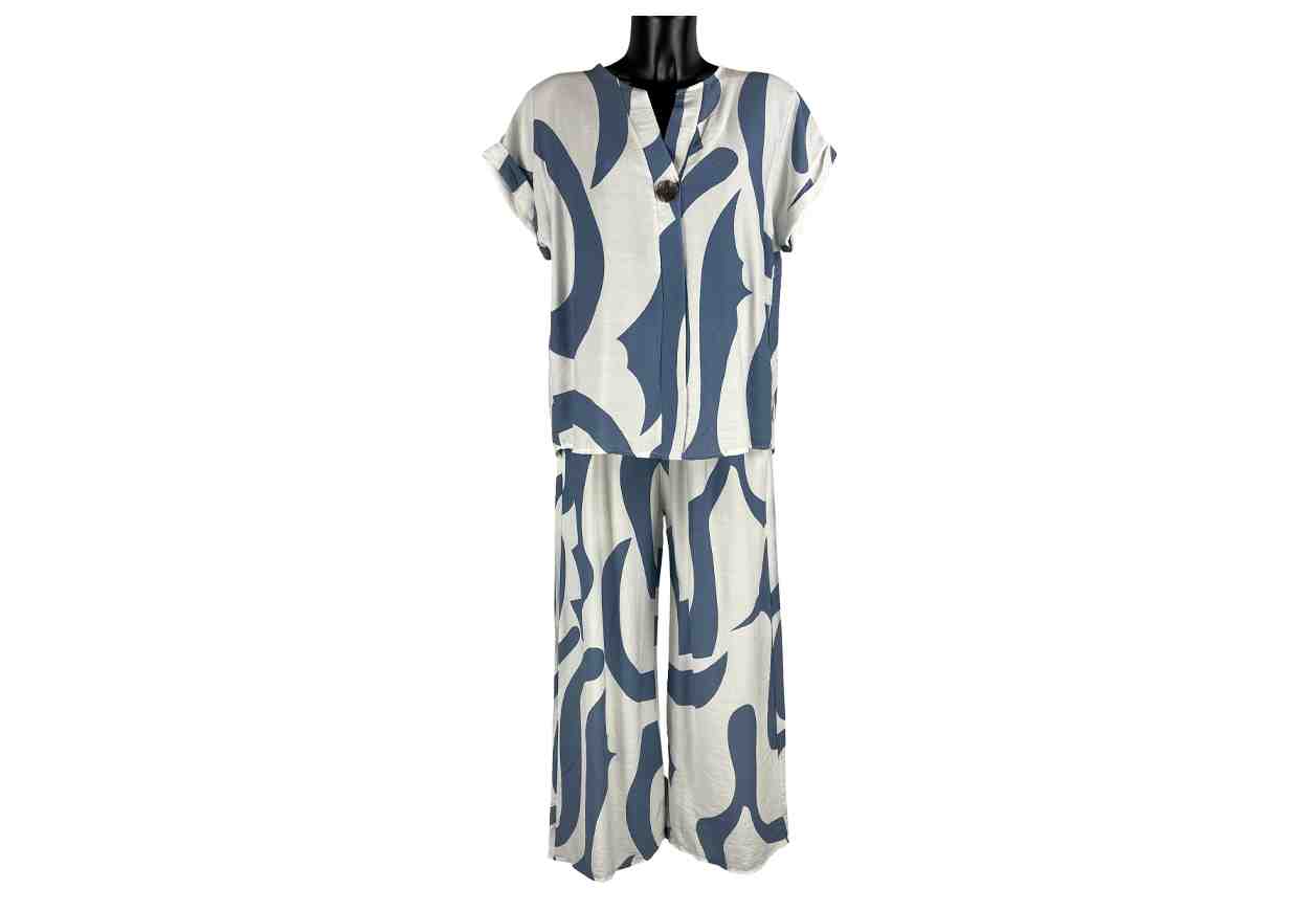 BUTTERFLY COMPLETO in fantasia: maglia con manica a pipistrello e doppia lunghezza, pantalone con elastico in vita e tasche laterali.
