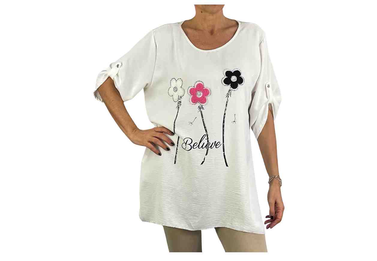 BUTTERFLY Maglia in tinta unita con scritta e fiori in bouclè, maniche a 3/4 e spacchi laterali.
