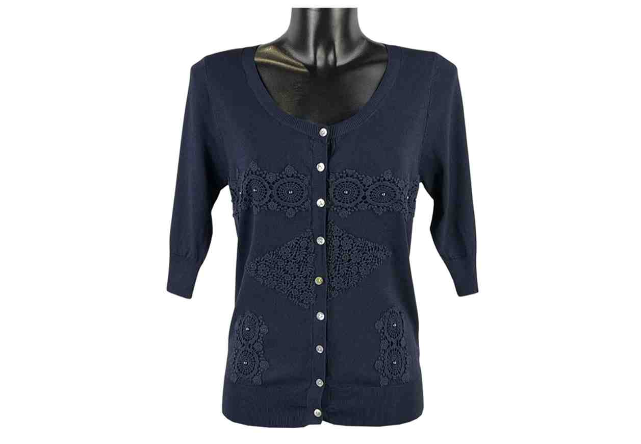 Cardigan in 100% viscosa con inserimenti in pizzo, perline e bottoni madreperla.