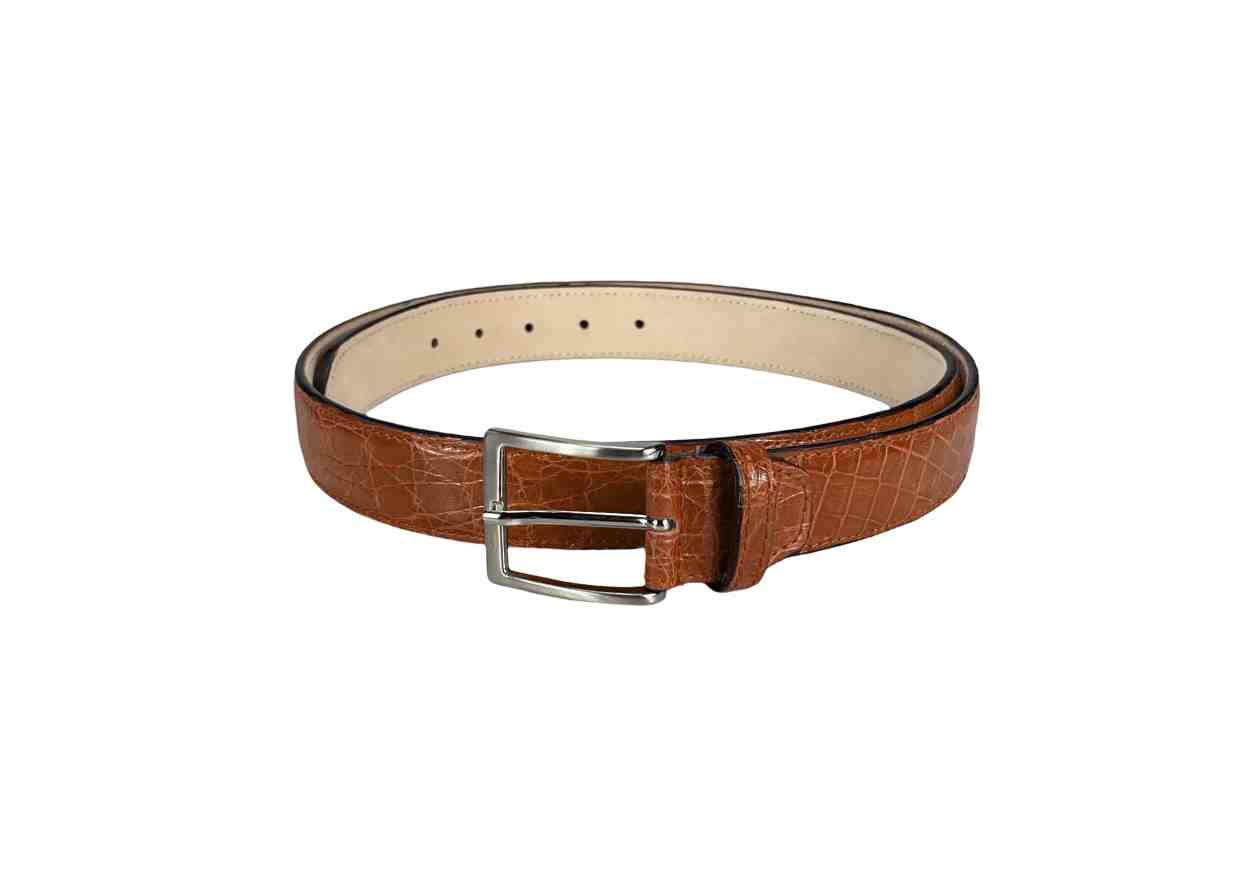Cintura in 100% coccodrillo con fibbia in ottone, regolabile.