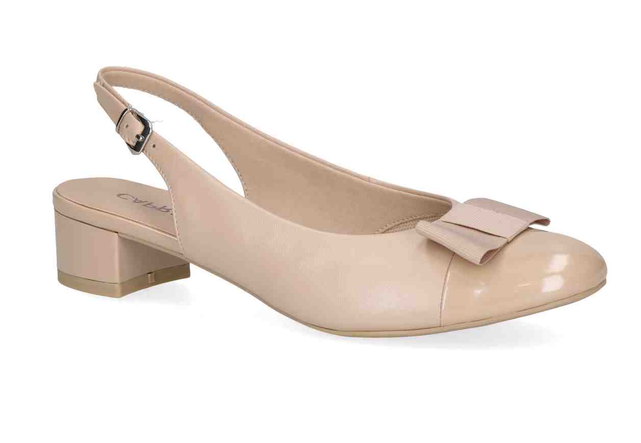 Décolleté in pelle con fibbia, fiocco frontale ed inserto in vernice.