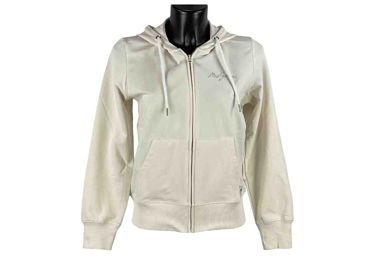 Felpa in 95% cotone garzato, 5% spandex, full zip, tasche e cappuccio. Brand lato sx in glitter termosaldati.