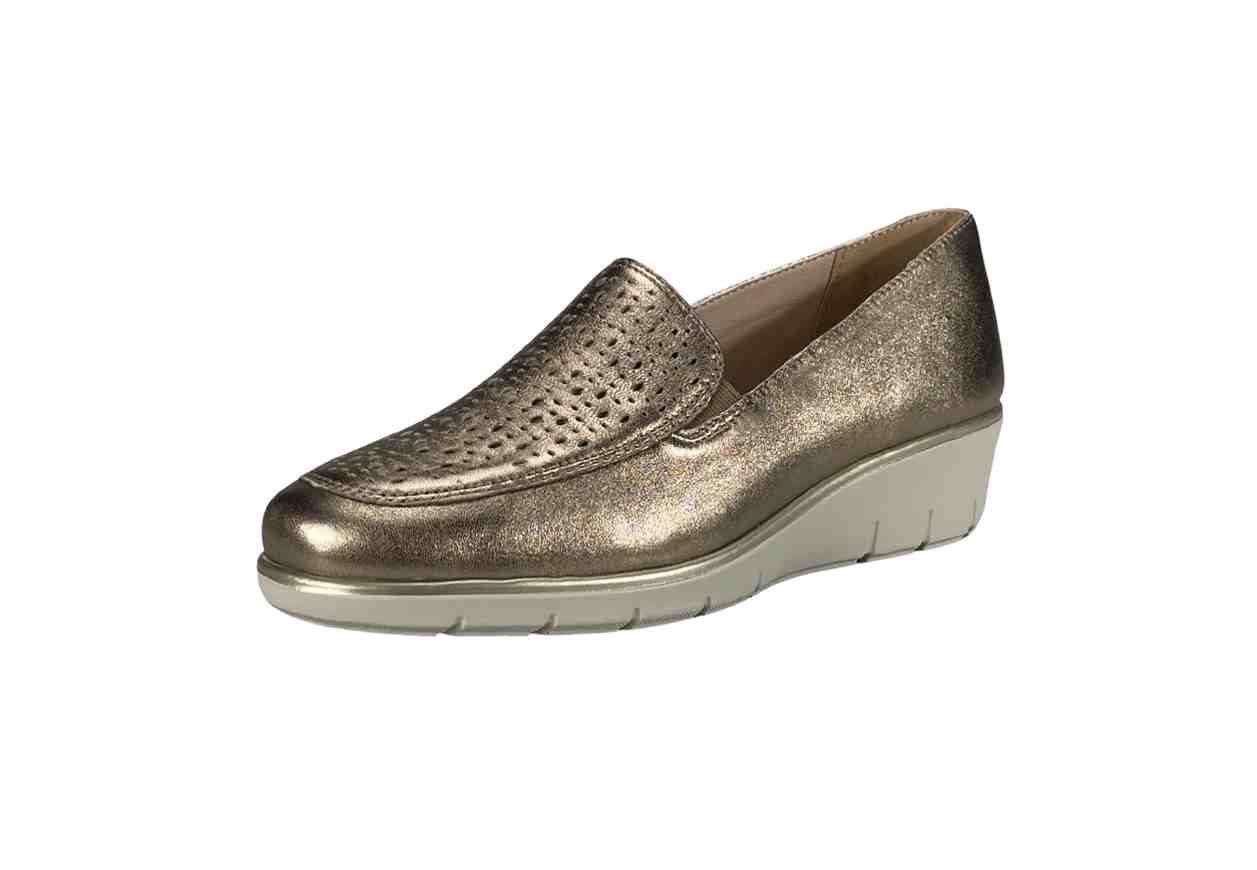 Descrizione prodotto:GREEN LAND Mocassino in pelle laminata con elastici, motivi traforati sulla tomaia. Zeppa 4cm.