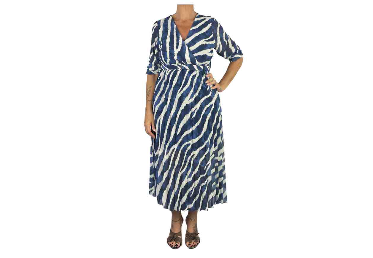 GRETA GARBO Abito in voile in fantasia zebrata, gonna plissettata con fodera interna, scollo a V incrociato e cintura in vita.