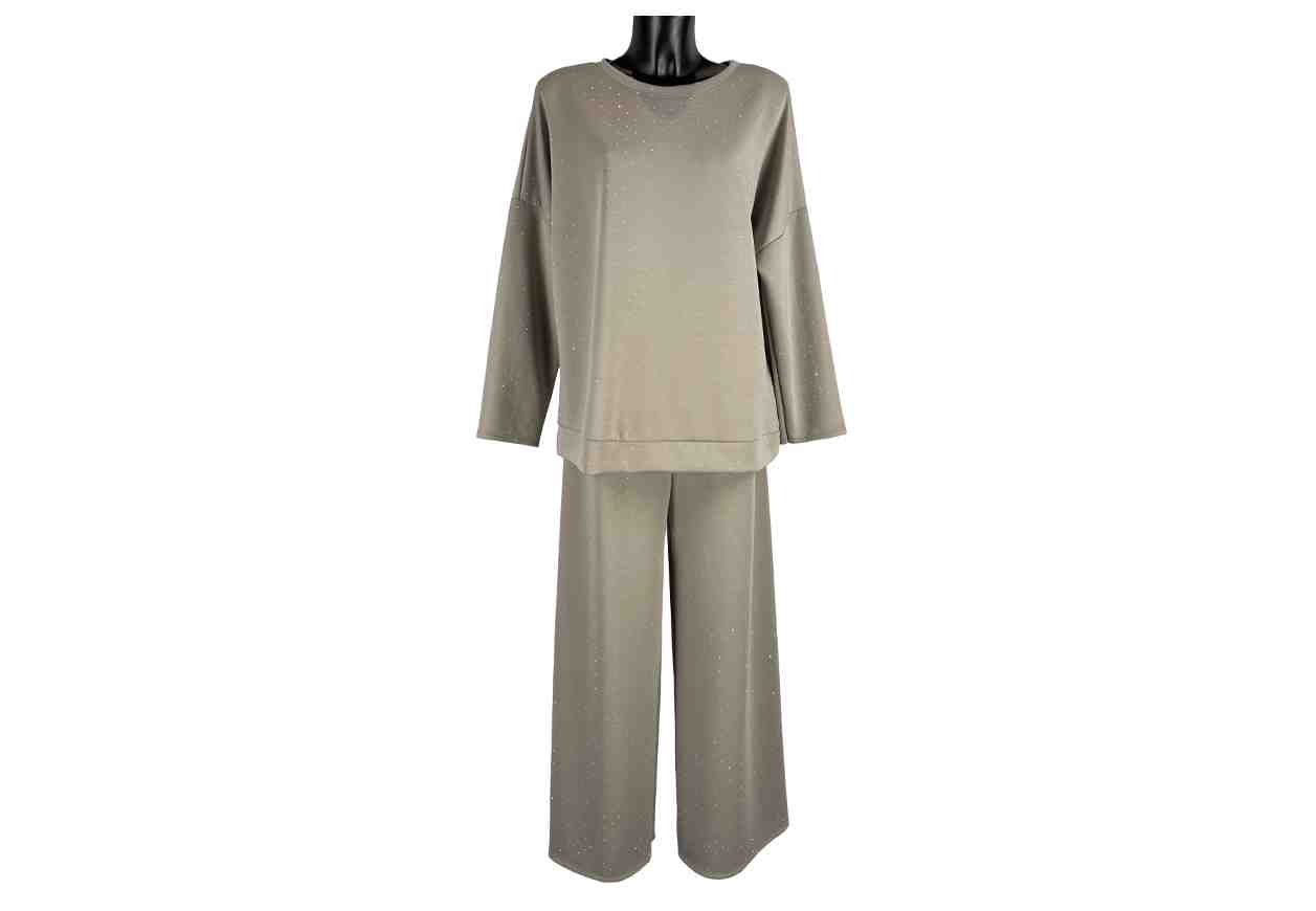 GRETA GARBO Completo in strass in tinta unita: maglia girocollo, pantalone con elastico in vita.