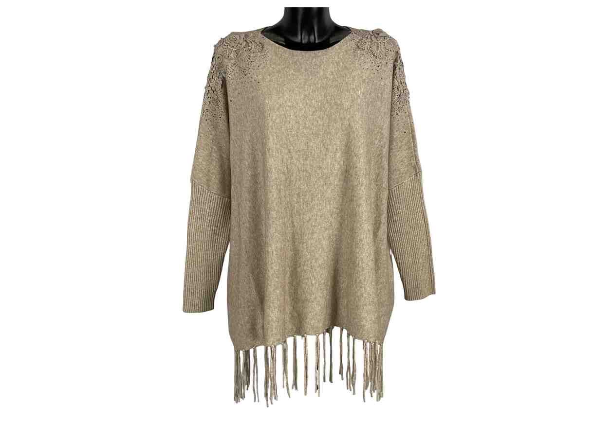 GRETA GARBO Maglia con inserti floreali e strass su spalle e frange sul fondo, tinta unita.
