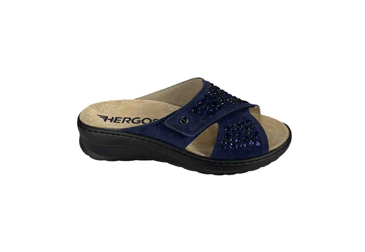 Descrizione prodotto:HERGOS Ciabatta a incrocio in pelle scamosciata con strass e velcro di chiusura, tacco a zeppa.