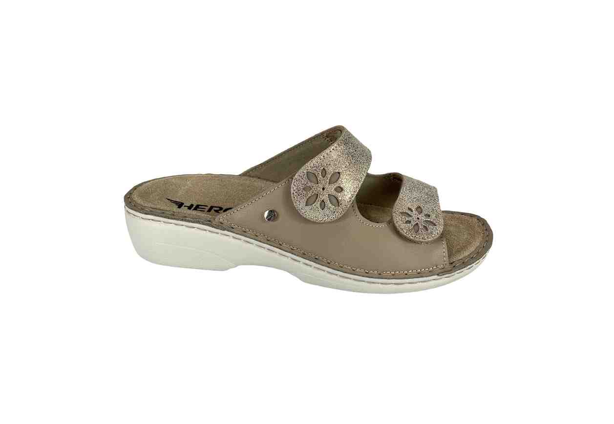 HERGOS Ciabatta in pelle con doppio velcro con dettaglio fiore.
