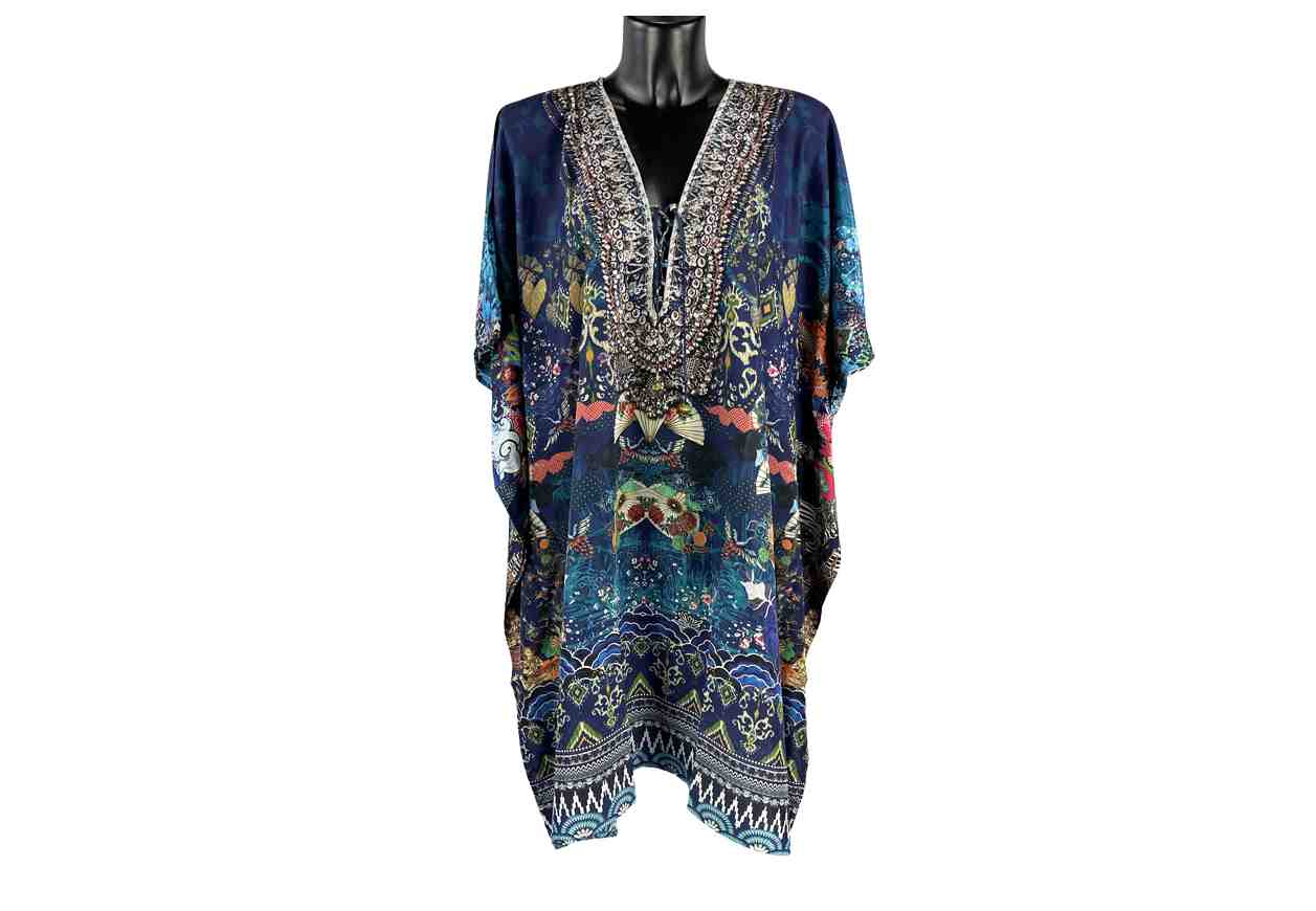 MAVIE Kaftano in fantasia, effetto seta, scollo a V con cordino intrecciato, dettaglio strass.