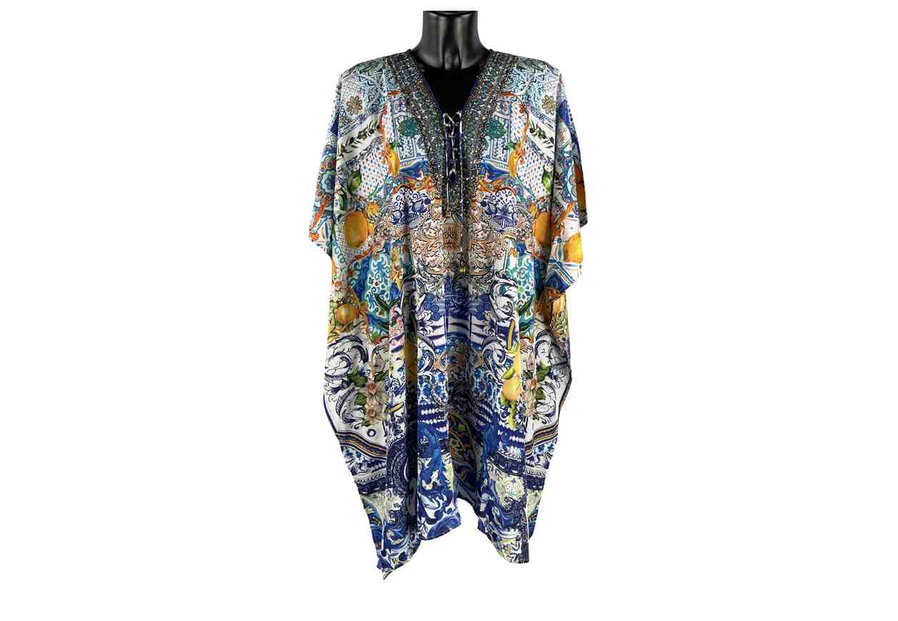 MAVIE Kaftano in fantasia, effetto seta, scollo a V con cordino intrecciato, dettaglio strass.