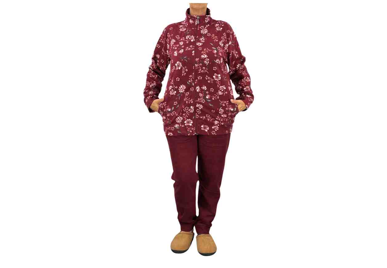 Pigiama in pile: maglia in fantasia a fiori con chiusura a zip, tasche laterali e maniche lunghe; pantalone in tinta unita con elastico in vita.
