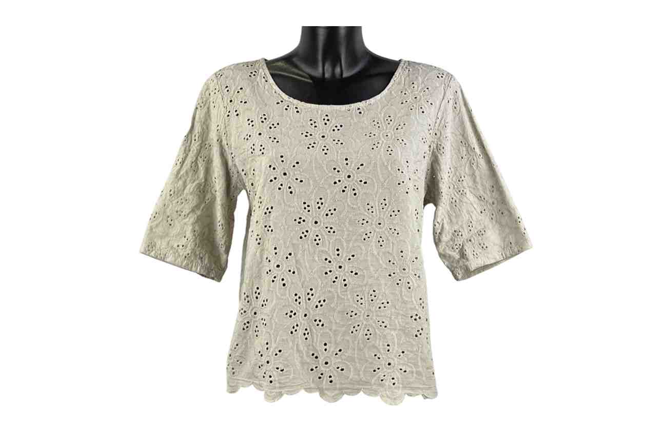 PINK LOVE Blusa in sangallo con ricami floreali, tinta unita e manica corta, bottoni sul retro.