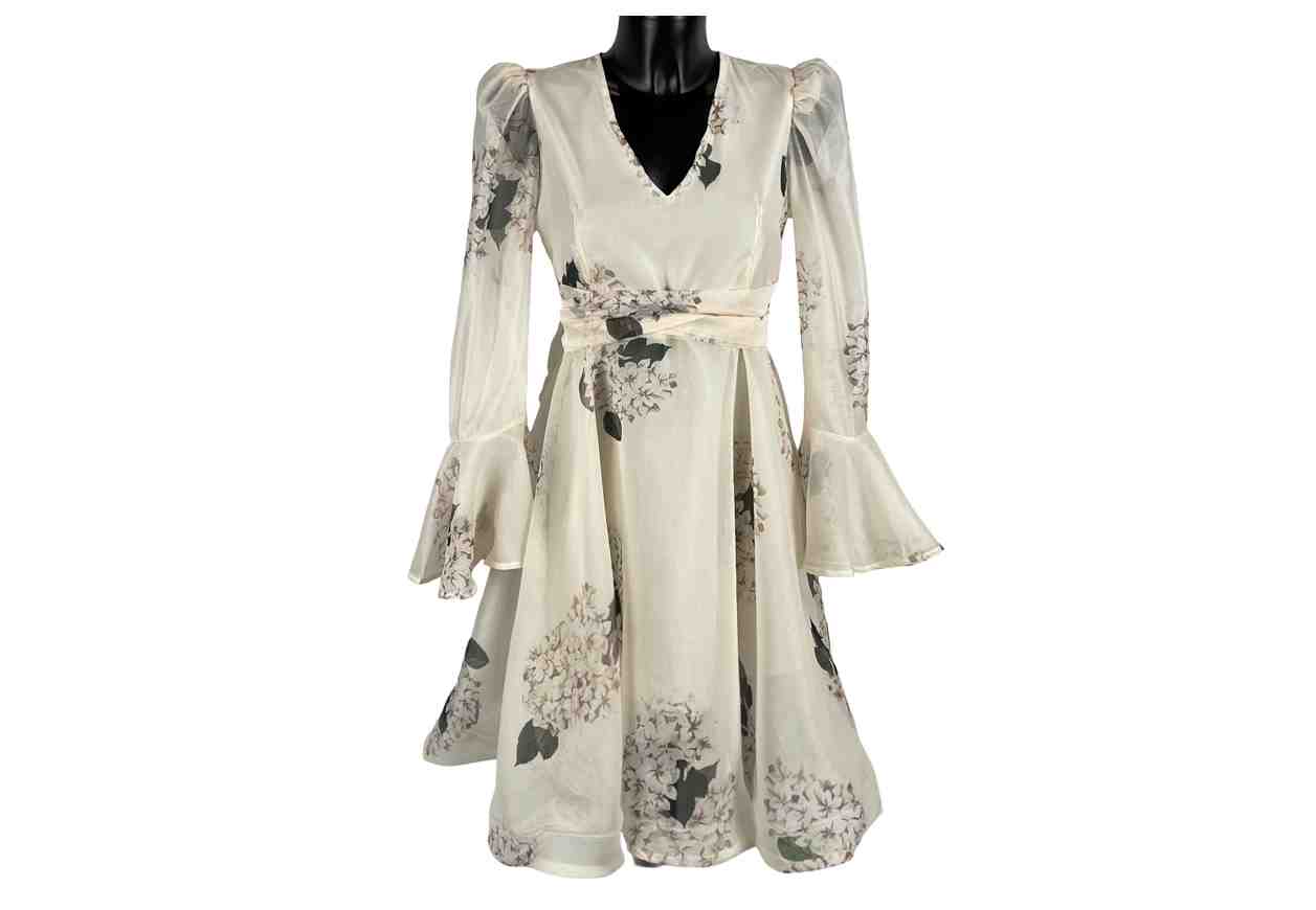 PINK LOVE LUX Abito in misto lino in fantasia floreale, scollo a V, balza su manica lunga e zip sul retro.