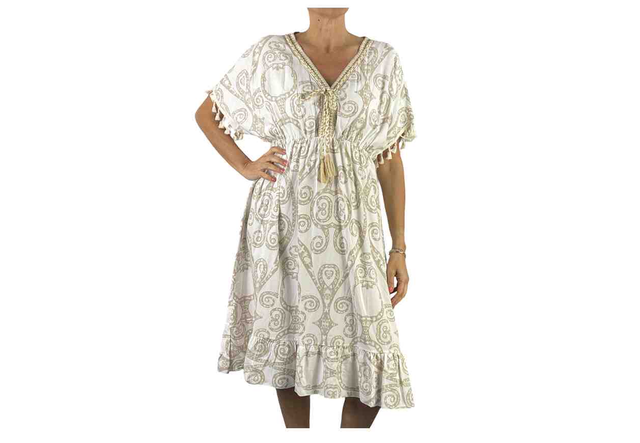 PINKLOVE Abito in fantasia astratta, dettaglio nappine e filo lurex, manica corta.