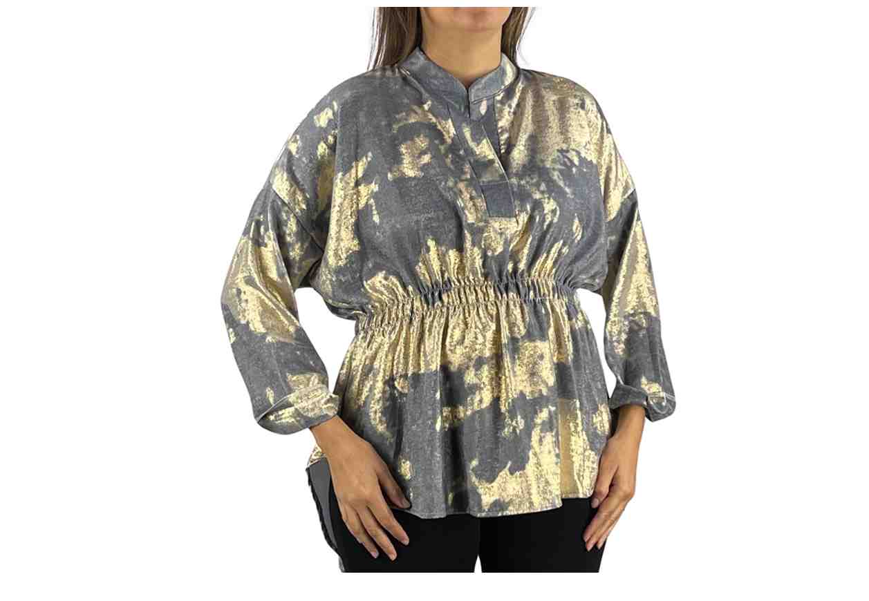PINKLOVE Blusa bicolore effetto laminato, elastico in vita, scollo a V, manica lunga.