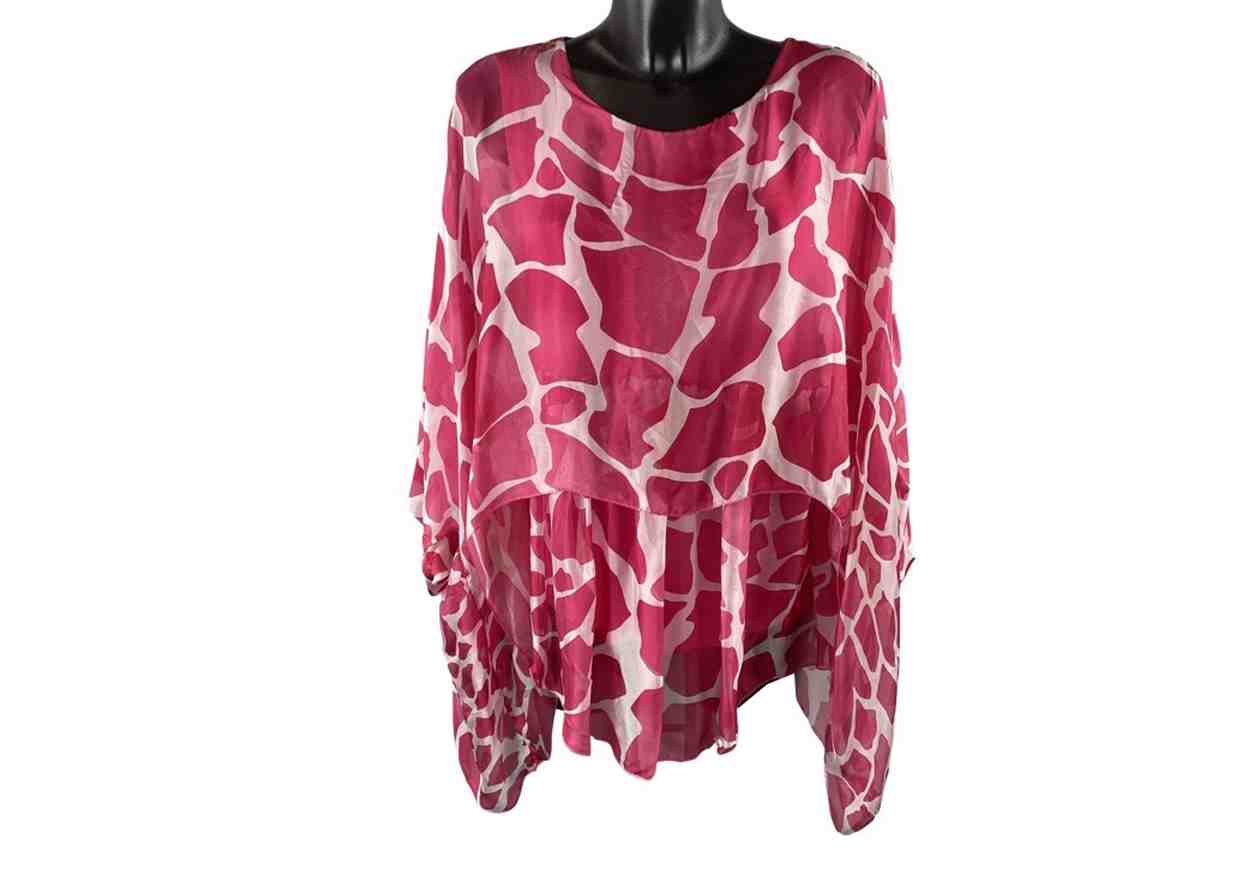 PINKLOVE Blusa velata con balza in fantasia giraffa, manica a pipistrello.
