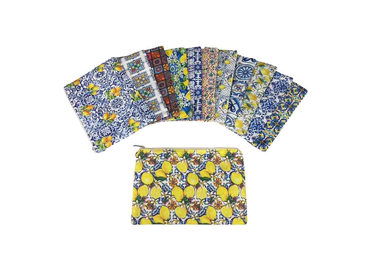 Pochette in tessuto stampa fantasia, fodera interna, chiusura con zip