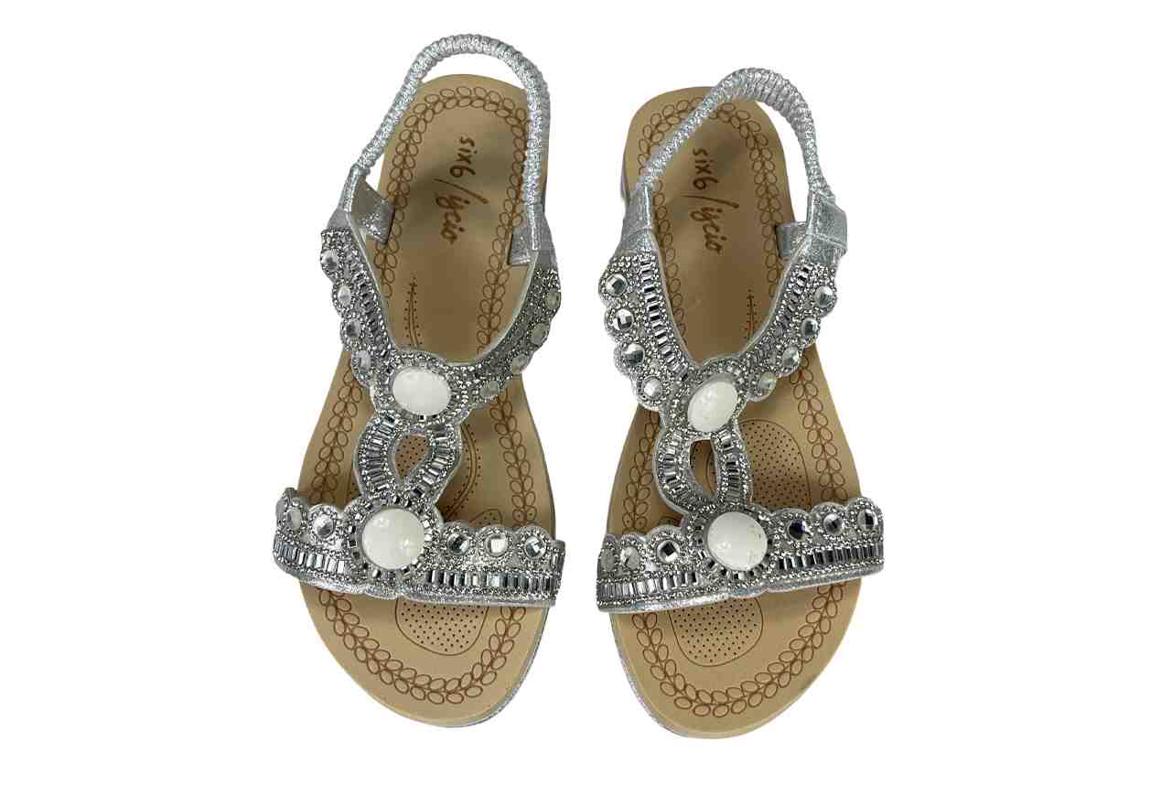 Sandalo in ecopelle con strass in dettaglio ed elastico alla caviglia.