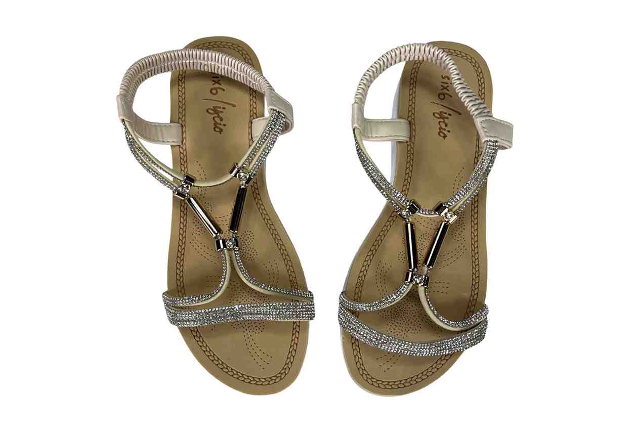 Sandalo in ecopelle con strass in dettaglio ed elastico alla caviglia.