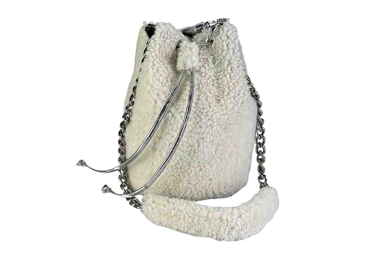 Secchiello in 100% montone con pelle laminata interna, tracolla metallica.