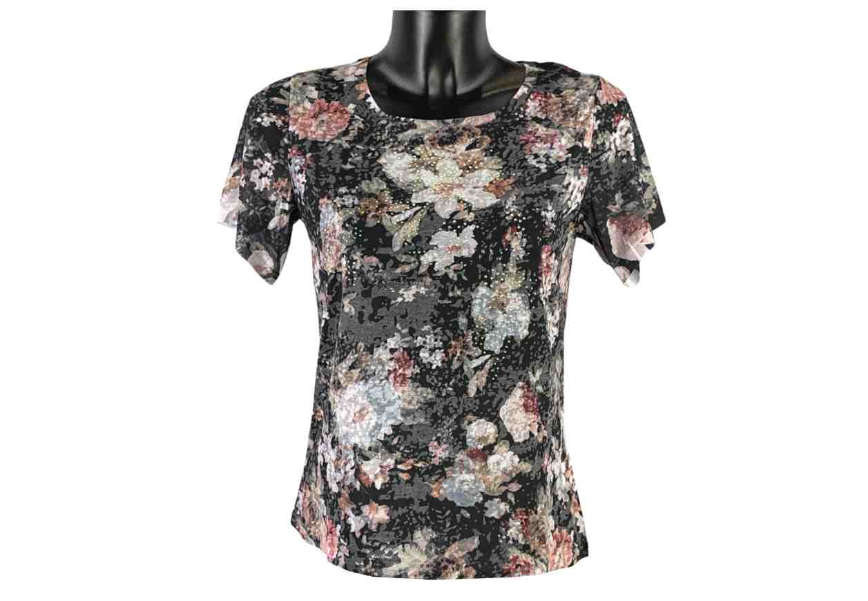 T-shirt motivo floreale con pizzo sul lato posteriore e strass termosaldati.