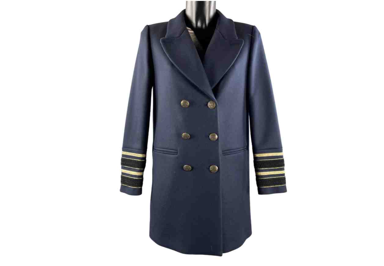 Caban in lana 77%, cachemire 3% e poliammide 20%, chiusura a doppio petto con rever. particolari cuciti sulle maniche.