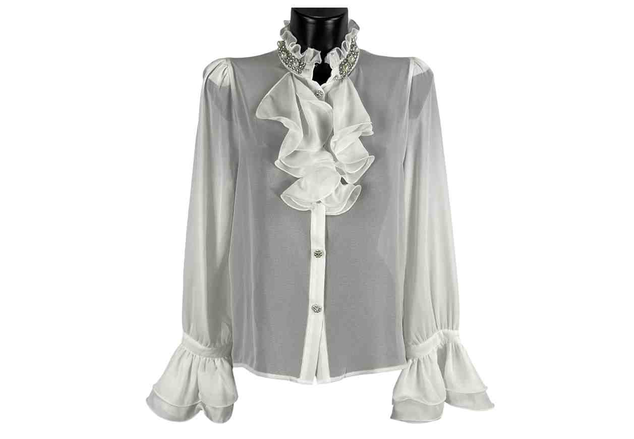VERONICA RIZZI Camicia in voile semitrasparente con rouches e strass in dettaglio su colletto, tinta unita.